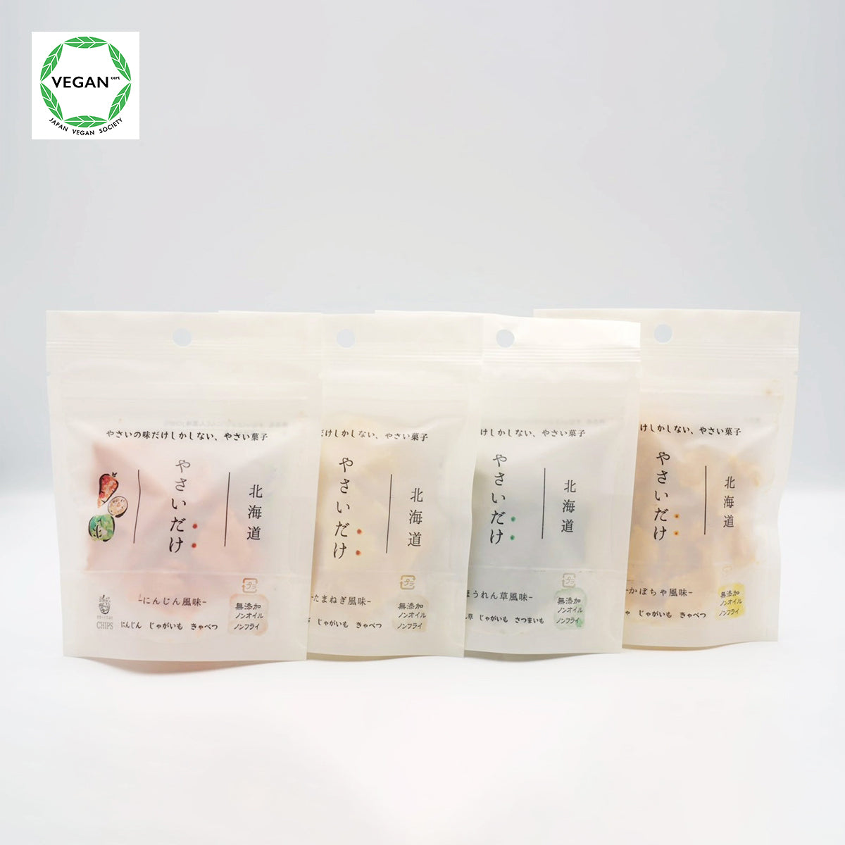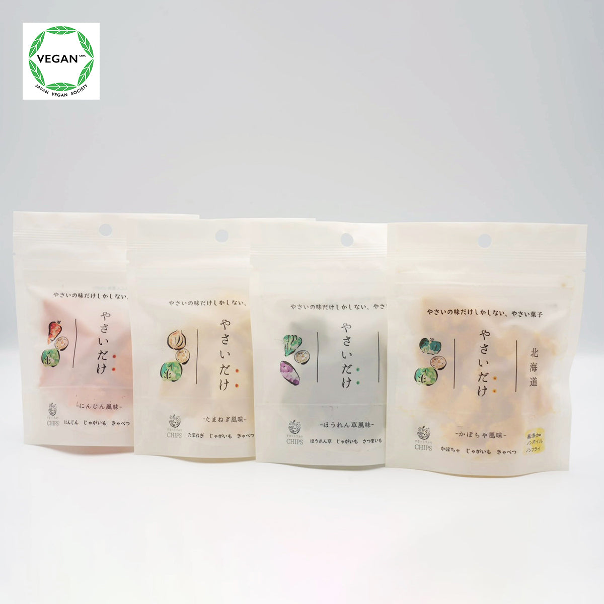 すなっくさぷりのにんじん風味、ほうれん草風味、たまねぎ風味、かぼちゃ風味の4種を一度に楽しめるアソートパック。